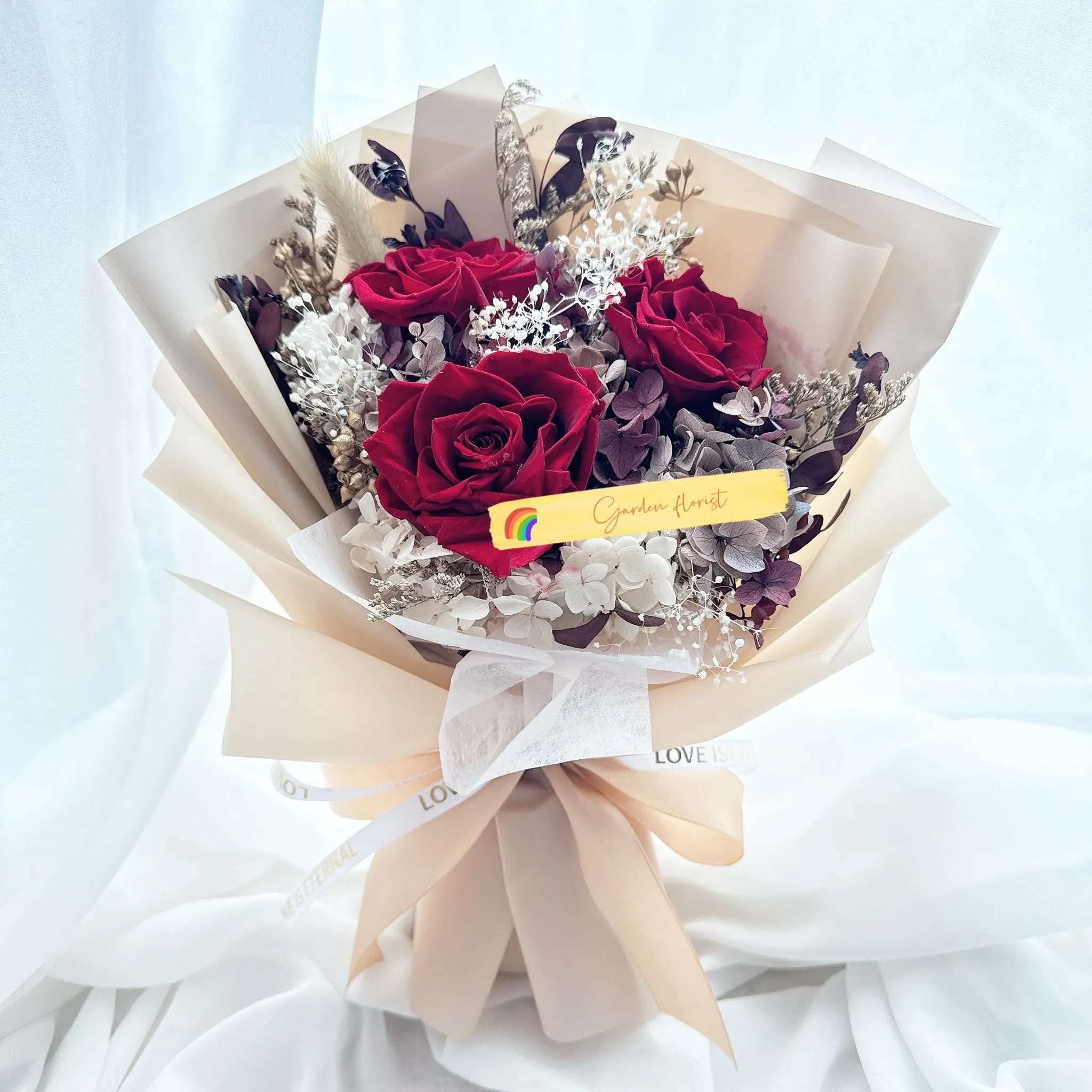 永生花束,融合花藝設計與時尚美感,精緻優雅,永恆綻放,是送禮與自用的理想之選。